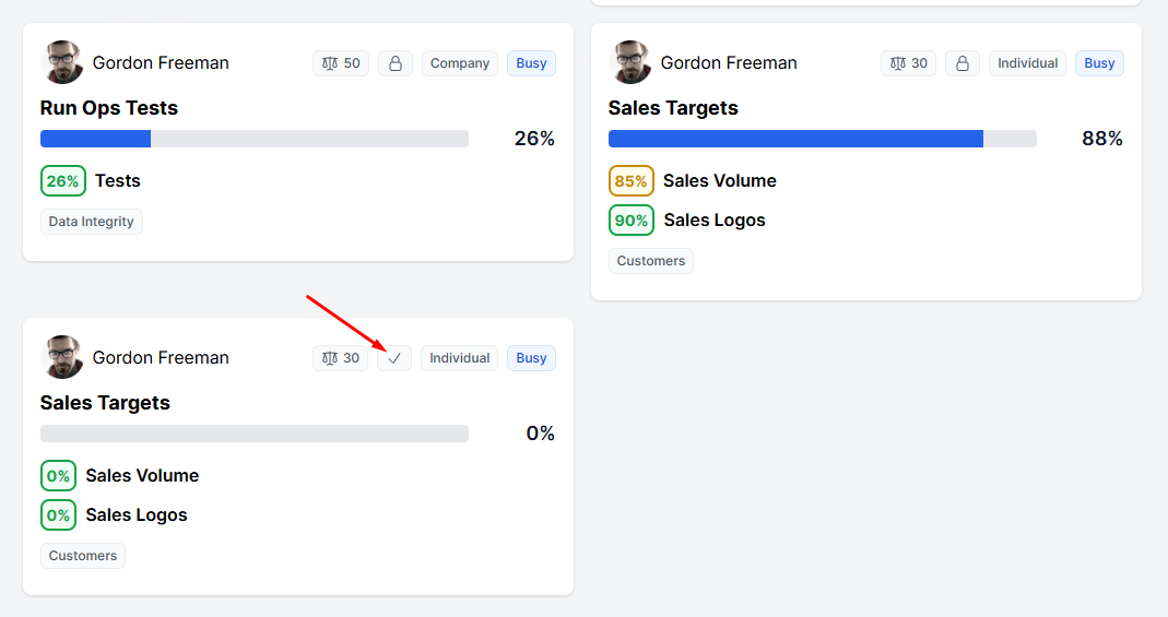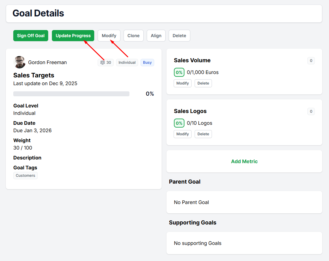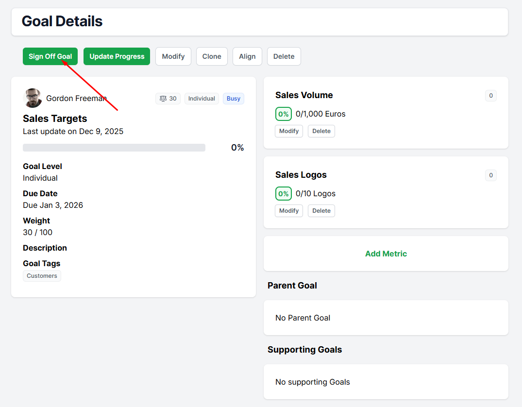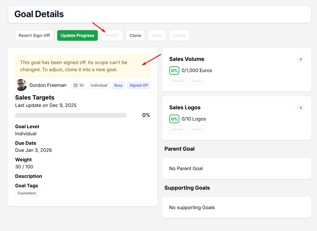 When a goal is "Signed Off," its targets and description are locked to prevent changes mid-cycle. However, the goal owner can (and should) continue to update their progress toward completion.